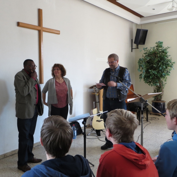 Pfarrer Cramer interviewte die Gäste und gab Fragen weiter, die die Konfirmanden im Laufe des Vormittags aufgeschrieben hatten.