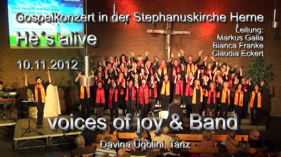 hieß es, als der Gospelchor "voices of joy" am 10. November 2012 die Bühne der Stephanuskirche betrat. Der Ruf "He's alive" bezeichnet nicht nur das österliche "Er ist auferstanden!", sondern zugleich auch das Bekenntnis, dass unser Gott ein sehr lebendiger Gott ist, der unsere Nähe sucht. Unter diesem Aspekt stand auch das Worship-Konzert, welches nicht nur zum Zuhören, sondern auch zum Mitmachen einlud.
