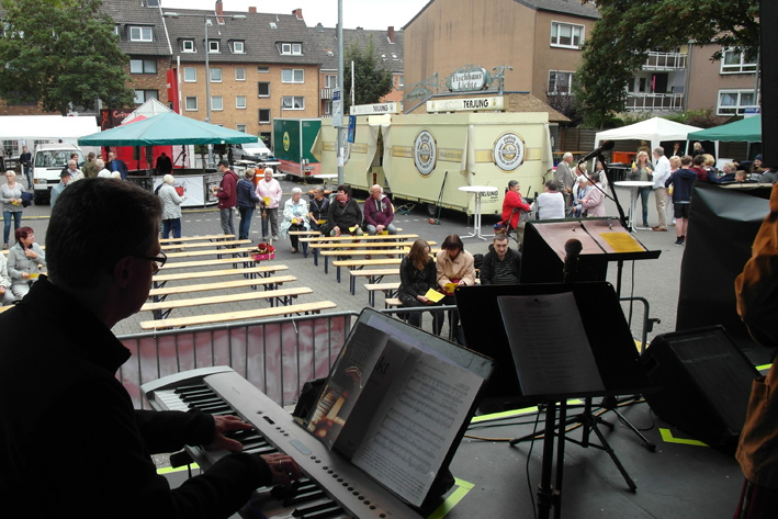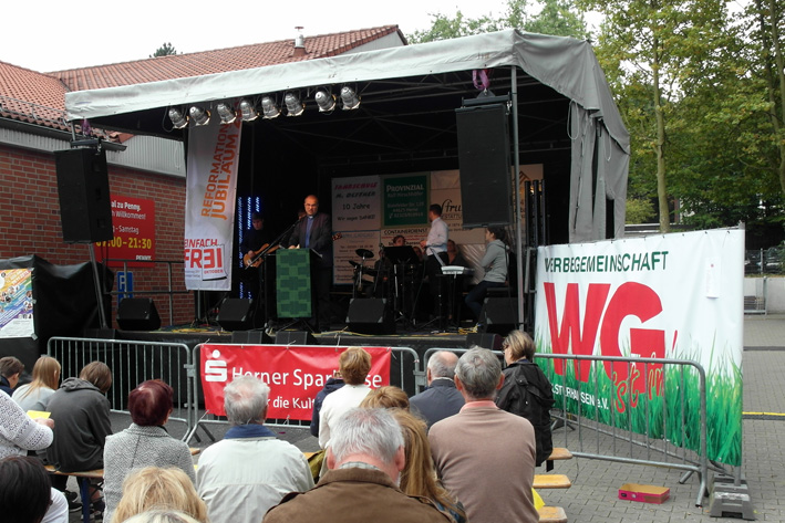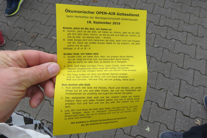 Zusammen mit Schwestern und Brüdern der katholischen Nachbargemeinden feierten wir den ökumenischer Open-Air-Gottesdienst an der Bielefelder Straße (Penny-Parkplatz) am 18. September 2016. Der Anlass dazu war das HerbstFest der Werbegemeinschaft Holsterhausen.